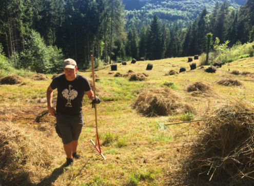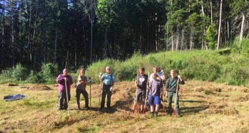 Einige Albvereinsmitglieder bei der Arbeit an den Dobelwiesen mit Rechen und Heugabeln