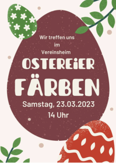 Ostereierfärben Sa., 23.03.2024, 72459 Albstadt Wir laden alle Grundschulkinder aus Laufen und Lautlingen zu uns ins Vereinsheim ein. Gemeinsam färben wir Ostereier und basteln ein schönes Osternestle. Uhrzeit: 14:00 - 16:00 Ort: Vereinsheim SAV Ortsgruppe Lautlingen Schloss 72459 Albstadt iCalendar Mit dem Laden der Karte akzeptieren Sie die Datenschutzerklärung von Google.Mehr erfahren Karte laden Google Maps immer entsperren zur Übersicht